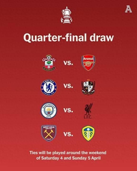 南安普顿(英冠第8)vs阿森纳,不得不说阿森纳继欧冠之后,足总杯也是好签运,踢个英冠球队,阿森纳可以轮换阵容,蓄力英超和欧冠争冠。 切尔西vs维尔港(英甲第24,第三级别联赛),切尔西上上签,遇上英甲副班长,这对于蓝军而言,或许就是送分题。 曼城vs利物浦,曼城运气是真背,欧冠1/8决赛抽到皇马,足总杯1/4决赛抽到利物浦,都是下下签,要想晋级,必须全力以赴,这会影响曼城在英超和欧冠的争冠局势。 西汉姆联vs利兹联,英超保级球队之间的对决,或许对于铁锤帮而言,英超保级才是第一任务,足总杯或许会适当放弃。足总杯1/4决赛会在国际比赛日后进行,也就是当地时间4月4日和5日进行,若常规时间战平,不会进行重赛,所有平局均进入加时赛,若加时未能决出胜负,就进行点球大战。
